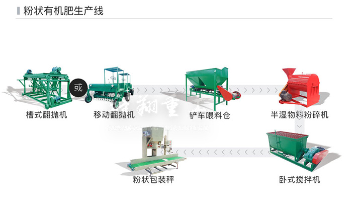 小型的粉狀有機(jī)肥生產(chǎn)線,適合剛起步的、資金不足的企業(yè)。生產(chǎn)能力不足的,或者資金不夠的廠家可以直接發(fā)酵腐熟之后粉碎即可作為粉狀有機(jī)肥料使用,包裝是為了順應(yīng)環(huán)保生產(chǎn)的要求,運(yùn)輸途中避免粉塵污染以及不必要的損失。下圖為年產(chǎn)2000~5000噸的豬糞有機(jī)肥生產(chǎn)線,主要包括發(fā)酵、粉碎、包裝三個(gè)環(huán)節(jié),其余的生產(chǎn)設(shè)備都只是為了提高生產(chǎn)線的自動(dòng)化程度以及增加有機(jī)肥料的營(yíng)養(yǎng)含量,可根據(jù)客戶需要進(jìn)行刪改。