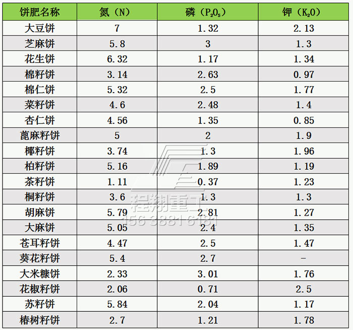 餅肥的成分與性質(zhì) 餅肥含氮1.11%-7.00%、五氧化二磷0.37-3.00%、氧化鉀0.85%-2.13%、有機(jī)質(zhì)75%-85%,還含有蛋白質(zhì)及氨基酸、微量元素等。菜籽餅和大豆餅中還含有粗纖維6%-10.7%,鈣0.8%-11%,膽堿0.27%-0.70%,此外,還有一定數(shù)量的煙酸及其他維生素類物質(zhì)。不同餅肥的養(yǎng)分含量不盡相同,具體的可以參考下邊的表格圖片。