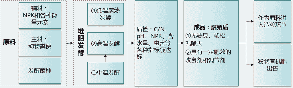 原料預(yù)處理包括固液分離、輔料粉碎以及對原料含水率、碳氮比、pH值的調(diào)整。好氧發(fā)酵環(huán)節(jié)包括翻拋、通風(fēng)等措施,對原料起到補(bǔ)充氧氣、控制溫度、散發(fā)水分和恢復(fù)孔隙率的作用。制粒成型是一項系統(tǒng)工程,圍繞制粒成型這一核心,前有粉碎、配料、混合等工序,后有烘干、篩分、冷卻等工序。