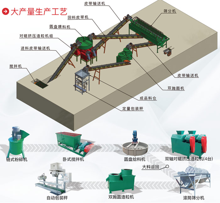 生產(chǎn)顆粒鉀肥的主要設(shè)備是干粉造粒機(jī),主要配套設(shè)備包括強(qiáng)制喂料器(主料斗)、對(duì)輥軋片機(jī)組、機(jī)架平臺(tái)、破碎整粒機(jī)、多級(jí)篩分器、鏈板輸送機(jī)、臥式攪拌機(jī)等。