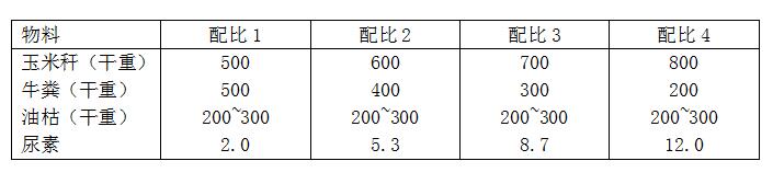主要選擇資源豐富的軟質(zhì)作物秸稈和畜禽糞便為主,將物料的C/N比值盡可能調(diào)節(jié)到25:1。根據(jù)各地原料的差異,選擇下表中所列物料配比中的一種(其他秸稈和畜禽糞便可參照該比例)。油枯應發(fā)酵結(jié)束前10 d左右按比例添加,均勻鋪在發(fā)酵堆上,通過利用臥式粉碎機將油枯與其他物料攪拌均勻,使用槽式翻堆機再堆制發(fā)酵。若加入油枯后堆溫超過60℃,應即時翻堆,防止油枯炭化和氨化。