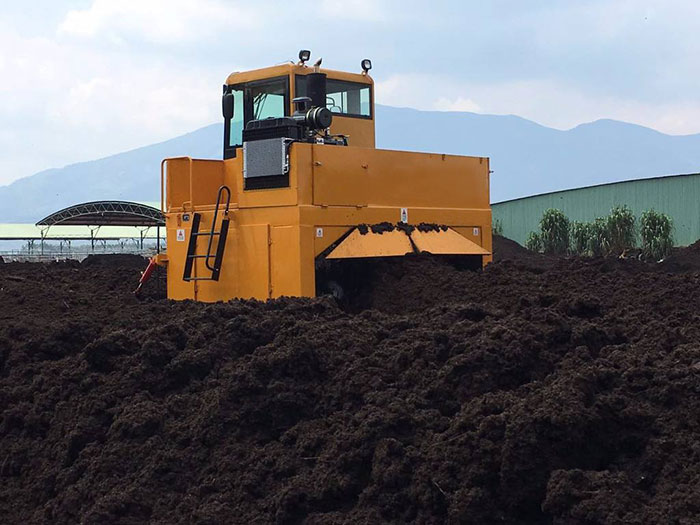 正在利用履帶翻堆機(jī)進(jìn)行翻堆的豬糞