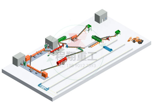 2. 翻堆車 3. 移位車 4. 鏟車喂料倉 5. 半濕物料粉碎機 6. 臥式攪拌機 7. 攪齒造粒機 8. 回轉(zhuǎn)式烘干機 9. 回轉(zhuǎn)式冷卻機 10. 滾筒篩分機 11. 自動定量包裝秤